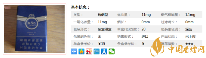 555配方555·金這款香煙香醇正,沉溢半濃,芬芳留長,煙氣柔和淡雅。這款煙受爭議較多,但是市場還是有的,老手值得品吸一下,新手慎入。據小編市場調查所知,555配方555·金售價定為15元/包。