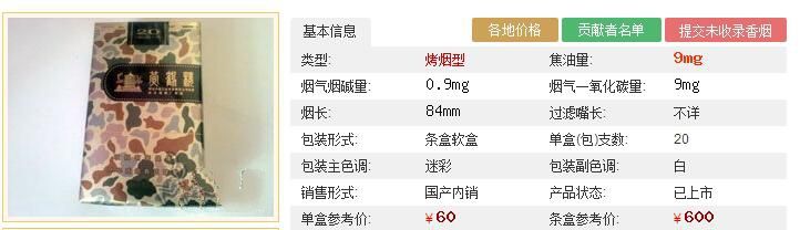 黃鶴樓香煙大彩(硬)綜合應(yīng)用國內(nèi)多產(chǎn)區(qū)煙葉,凸顯立體吸味。在配方技術(shù)上,充分利用增香功能薄片、亮色煙等復(fù)合配方技術(shù),在豐富了產(chǎn)品香韻,降低焦油至6毫克。黃鶴樓大彩的煙支采用了焦油標尺刻度,消費者可以輕松了解并掌控攝入的焦油含量。采用大漠迷彩紋飾,賦予產(chǎn)品特別的身份象征,與其他產(chǎn)品形成天然的視覺區(qū)隔,帶、一股特別的時尚硬朗氣息。