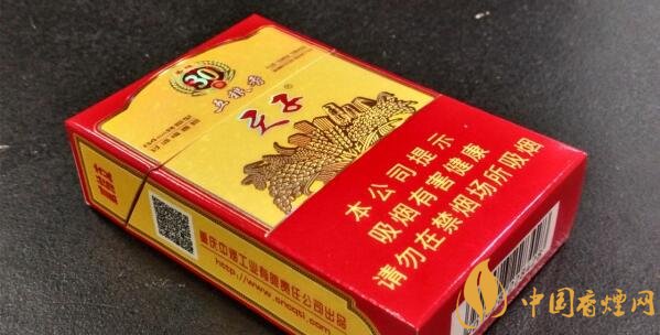 外包裝,亮黃亮紅雙色搭配營造出一份喜慶而又高貴的氣勢,天子五糧香品名、30年香珠標志、五糧圖案倶都出現在煙盒的正反兩面,整體感很好,視覺效果不錯。