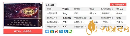 | 類(lèi)型 :烤煙型 | 焦油量 :9mg | 煙氣煙堿量 :0.9mg | 一氧化碳量 :8mg |