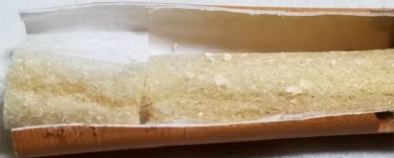 剖開濾嘴...是兩段式濾嘴,前段占據2/3,絲束里夾雜細碎的白色顆粒,想來是細微甜。濾嘴有降焦孔,基本開在了整個濾嘴的中段位置。從兩段絲束的顏色變化來看,基本均勻,略微變成了淡黃色。看來煙支的延燒性、空氣的介入等調節得都比較理想。香之物。